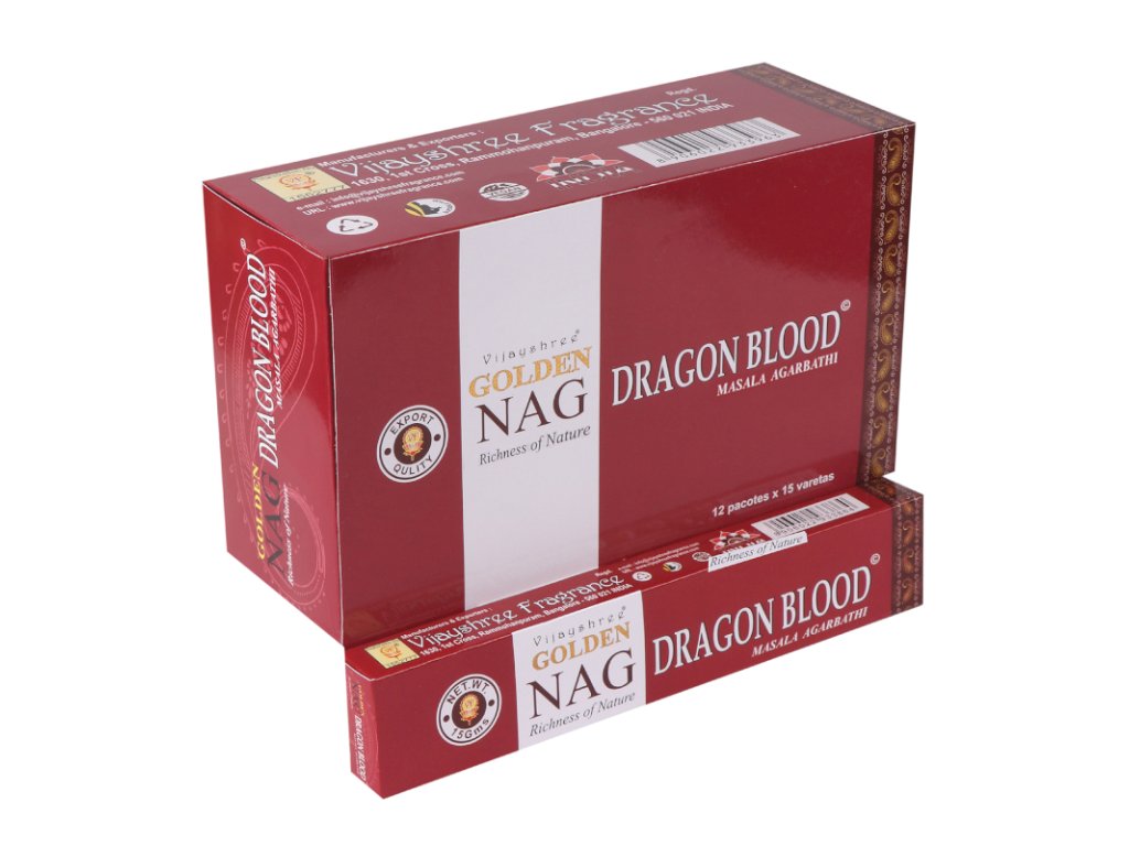 Golden Nag - Dragon Blood 15g je vyrobené zo 100% prírodných materiálov, bez akýchkoľvek chemických prímesí. Obsahuje Plumeriu, známu viac ako Frangipani. Zmes polokvapalných živíc, prevzatých zo stromu Ailanthus malabarica im poskytuje charakteristickú krémovú farbu a vlhkú textúru. Po ich zapálení sa vo vašej miestnosti vyskytne veľmi príjemná vôňa po dlhú dobu a vytvorí Vám príjemnú atmosféru. Sú ručne šúlané v Indii pomocou čistých výťažkov a najjemnejších vonných olejov.