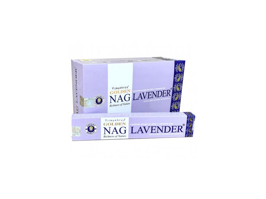 Golden Nag - Lavender 15g je vyrobené zo 100% prírodných materiálov, bez akýchkoľvek chemických prímesí. Obsahuje Plumeriu, známu viac ako Frangipani. Zmes polokvapalných živíc, prevzatých zo stromu Ailanthus malabarica im poskytuje charakteristickú krémovú farbu a vlhkú textúru. Po ich zapálení sa vo vašej miestnosti vyskytne veľmi príjemná vôňa po dlhú dobu a vytvorí Vám príjemnú atmosféru. Sú ručne šúlané v Indii pomocou čistých výťažkov a najjemnejších vonných olejov.