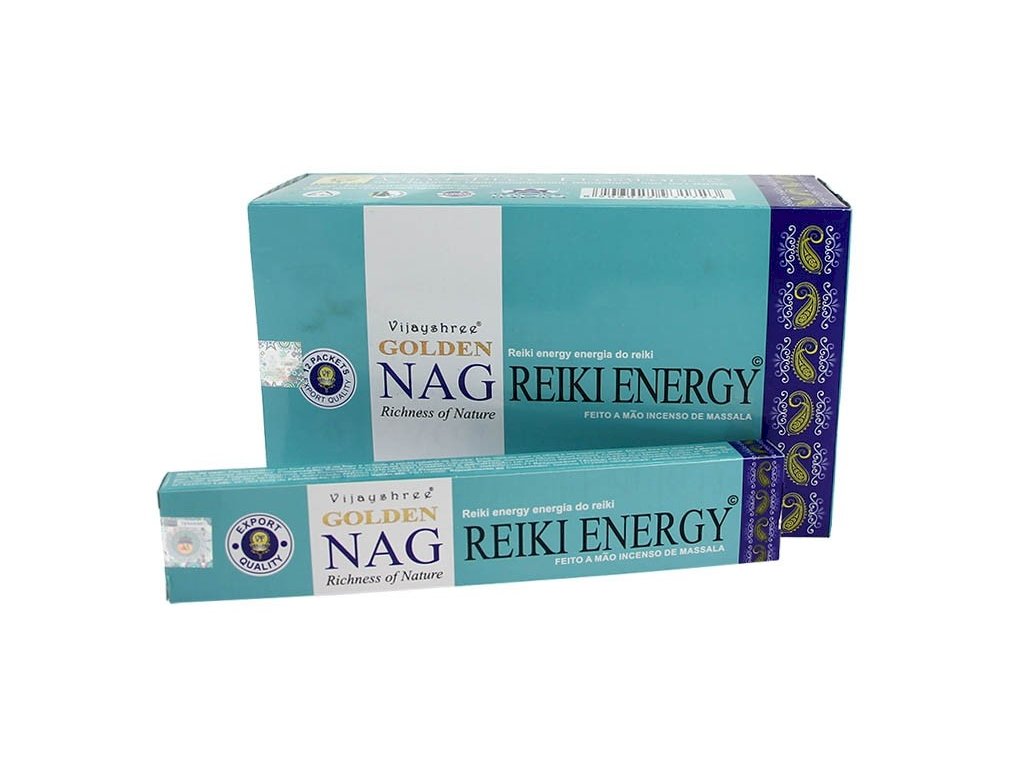 Golden Nag - Reiki Energy 15g je vyrobené zo 100% prírodných materiálov, bez akýchkoľvek chemických prímesí. Obsahuje Plumeriu, známu viac ako Frangipani. Zmes polokvapalných živíc, prevzatých zo stromu Ailanthus malabarica im poskytuje charakteristickú krémovú farbu a vlhkú textúru. Po ich zapálení sa vo vašej miestnosti vyskytne veľmi príjemná vôňa po dlhú dobu a vytvorí Vám príjemnú atmosféru. Sú ručne šúlané v Indii pomocou čistých výťažkov a najjemnejších vonných olejov.