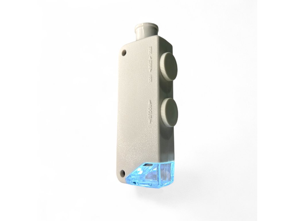 Prenosný mikroskop s nastaviteľným zvýšením medzi 160 a 200. S LED osvetlením pre dostatočné osvetlenie objektu. Obsahuje kožené puzdro a batérie.