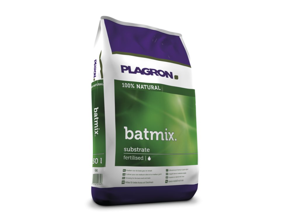 Plagron Batmix je vysoko kvalitná zmes, ktorá obsahuje tie najlepšie druhy rašelín. Tento predhnojený substrát je zložený z bielej rašeliny, čiernej rašeliny, vláknitej rašeliny, perlitu, verikompostu, organických NPK hnojív v pomere 3-15-4 a netopierieho trusu. Prítomný perlit a vláknitá rašelina skvalitňuje štruktúru, zvyšuje prevzdušnenosť, ľahkosť a okysličenie. Dostatočné množstvo vermikompostu Plagron zaisťuje silný rast rastlín a zvýšenie schopnosti zadržať vodu. Hlavným zdrojom živín v Batmix je netopierí trus (Bat Guano), ktorý obsahuje fosfor a draslík a tým je zaručený veľmi dobrý rast rastlín.
